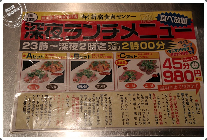 | 這一家是非常隱藏版的人氣燒肉店,小小一間但是人潮從來沒有斷過,位於新宿歌舞伎町內區內,最熱門的時段就是每天宵夜時段一個人980日幣吃到飽,雖然肉品單調但是可以花少少的錢狂吃燒肉的感覺非常好。 |