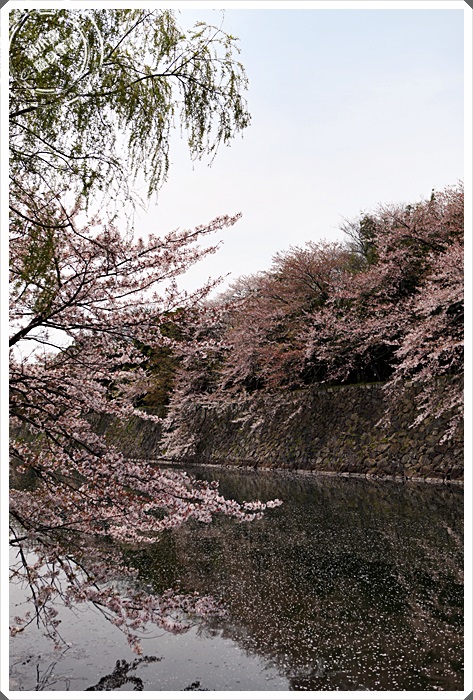 | 旁邊的護城河有的地方真的已經積了一大片的櫻花花瓣,這個在過一陣子就可以把整個護城河都鋪滿了粉色的櫻花了。 |