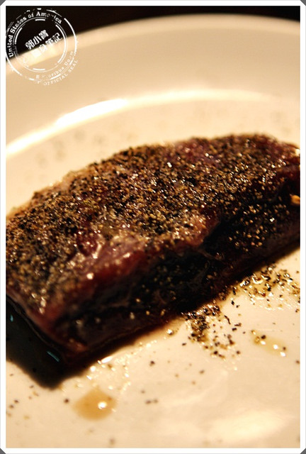 | 另一個比較特別的就是這樣,看牛肉上灑滿了黑胡椒粒,難怪會鹹成這樣,上面再放個牛油塊,