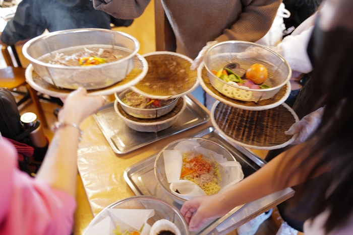 | 店家會依照人數來幫忙安排座位,建議不要自己找座位,我們被安排上了二樓,然後放下背包就去領取自己的食材,接著就準備去用溫泉的蒸氣來清蒸我們的午餐了。 |