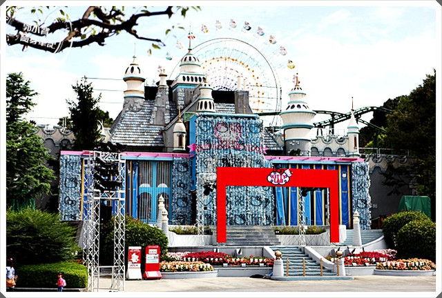 | 走進廣場後就可以看到主舞台跟後方Hello Kitty的家了,主舞台有限定的晚間煙火表演秀,
