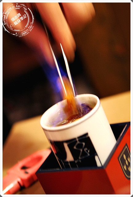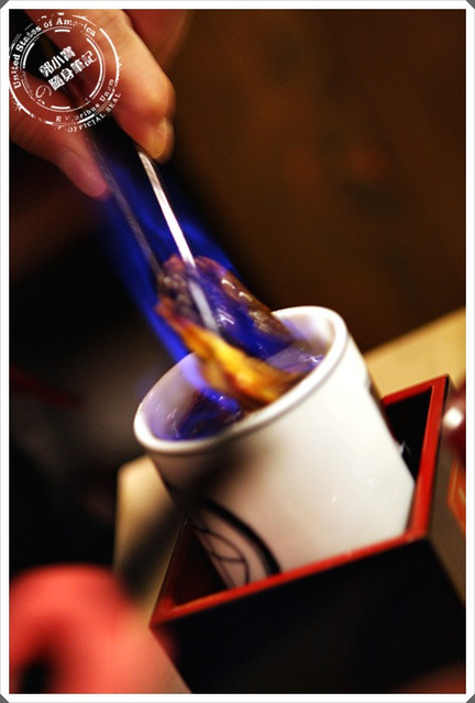 | 服務人員把河豚魚翅浸泡過清酒後,點上火後再持續在清酒杯裡來回,真的是讓大開眼界。 |