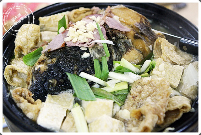 在大家飽到一個不行的時候,最後突然上了這一大鍋,嚇到我們了,我印象中沒點沙鍋魚頭, 我記得是點另一道店家招牌啥土雞的,總舖師拿著菜單出來給我們說,有啊!!有沙鍋魚頭啊一一