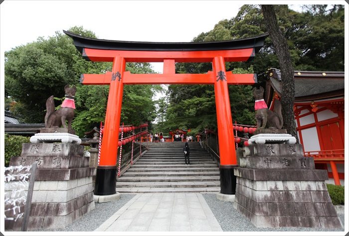| 左手邊有個朱紅大鳥居,沿著階梯往上爬就可以看到千本鳥居了,這也是大部分遊客來這邊的目的。 |
