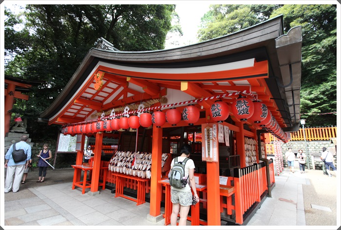 | 到達伏見稻荷大社的廣場時感覺到異常的熱鬧,原來是伏見稻荷大社一年一度的本宮祭快來臨了,所以燈籠已經是滿滿的了。 |