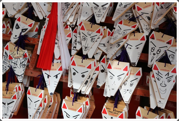這邊也是供奉著稻荷大神,其中另一個比較高的築台是禁止攝影的,小寶拍了兩三張後才發現有掛著禁止攝影的牌子,才不好意思的把照片刪除以示尊重,另外這邊販售的繪馬讓我覺得更可愛了,是稻荷大神的臉部,遊客跟信徒可以自由在繪馬上作畫,