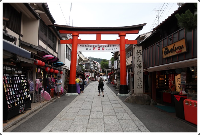 | 話說伏見稻荷神社有好幾處出入口,這個出入口是最多人出入的,因為離車站最近,反而大門到最後都會變成大家最後的出口,這條街上的商店林立還滿好逛的,賣了很多伏見稻荷的特色小物,都非常的精緻讓人愛不釋手,我們也在這邊敗了不少。 |
