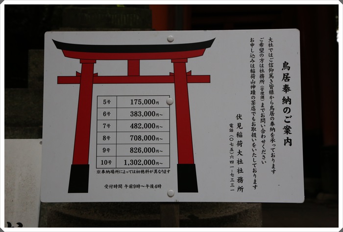 一旁有個牌子讓我更有興趣,這牌子上寫的是捐獻鳥居的價格表,基本上除了客製化訂做巨大或是超大的鳥居外,除了特別其他的材質訂做,基本款看這邊選尺寸就可以了。