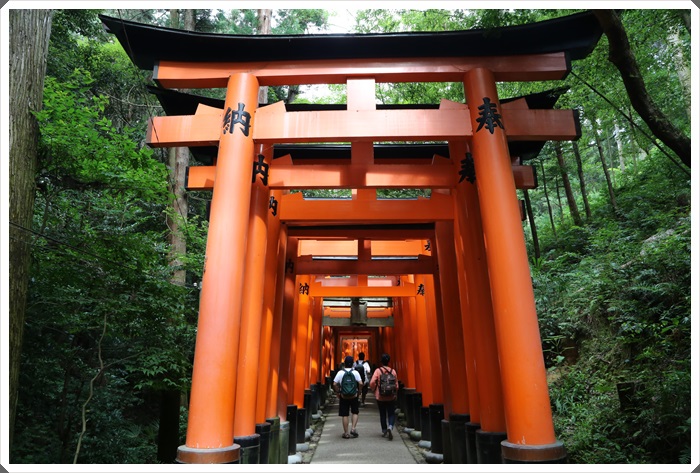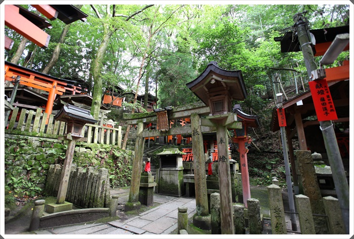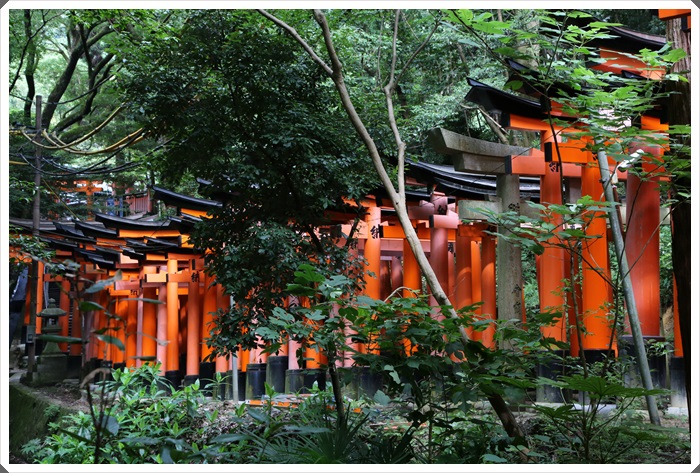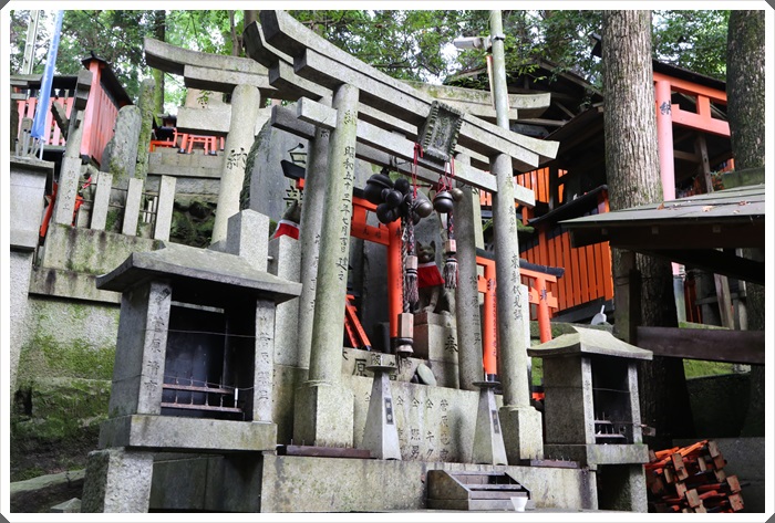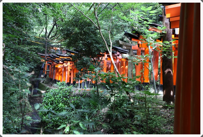 | 如果是夏天來走的話,到達這邊就會陰涼許多了,因為大概已經走到了山林裡面了,不得不佩服這些鳥居可以依著山路這樣崎嶇的一路蓋上去。 |