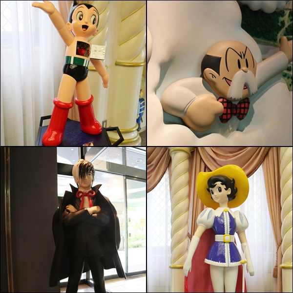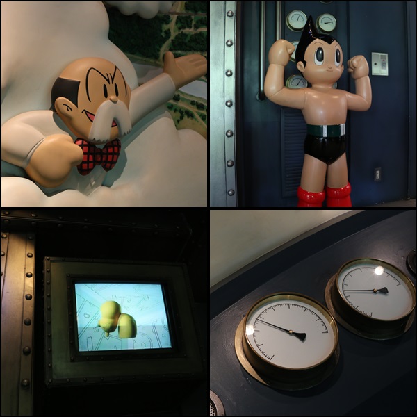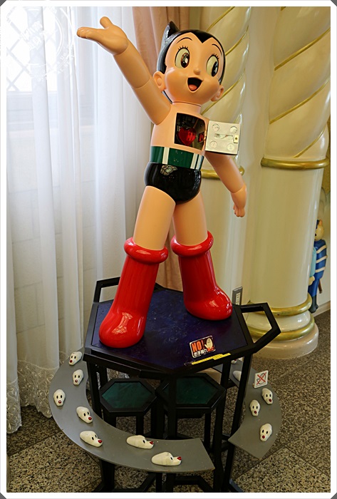 | 入口處右邊有宛如手塚治虫兒子般的原子小金剛歡迎大家,是一尊大型的公仔,胸口可以打開,裡面是一顆發像的愛心。 |