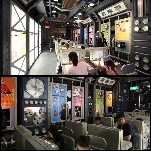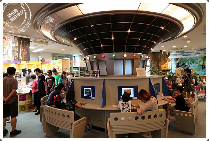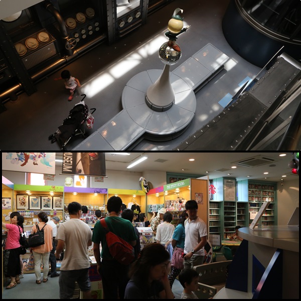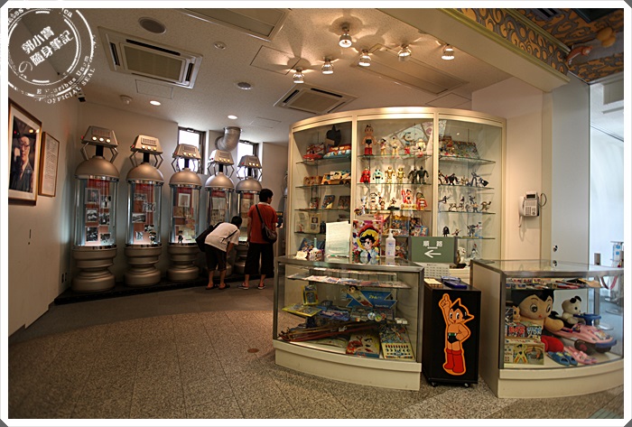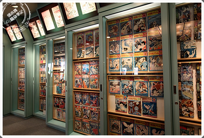 | 一樓最後到達的空間是販售紀念品的地方,我們在這邊買了一些小東西,這邊也是親子聚集的地方,有很多互動式的遊戲,小朋友在這邊都玩的不亦樂乎,一旁的書櫃上也有手塚老師全部的漫畫集,不過都是要透過玻璃窗欣賞而已,不能翻閱。 |