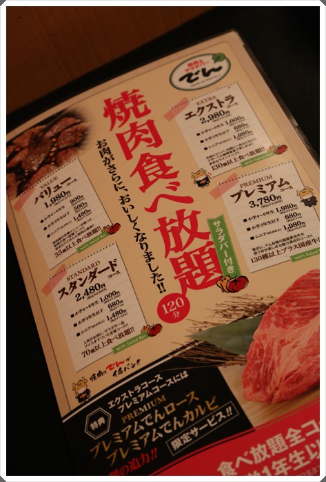 | 菜單送上來的時候,我們還真的猶豫滿久的,燒肉でん吃到飽的價格目前分成四種,看了一會後我們就覺得右上角的2980了,現在想想其實應該直接衝到3780才對阿XD |