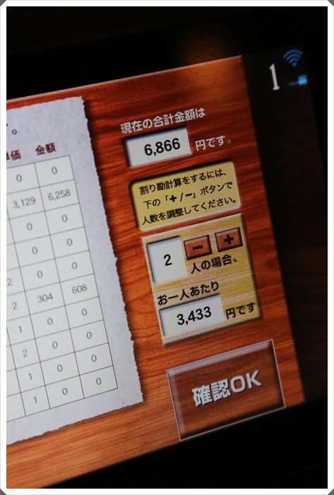 | 時間一到平板電腦就會關閉點菜的畫面,而且會自動將消費的金額秀在上面,我們兩個人加上稅金還有喝飲料總共是6866日幣,大約台幣兩千多,在日本其實我覺得還好。 |