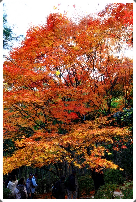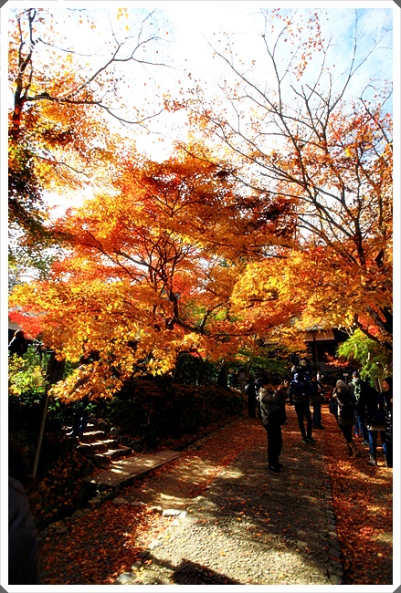 但是還是擠滿了來賞紅葉的民眾,不只天空被紅葉染紅,連地上也被掉落的紅葉染紅了,
