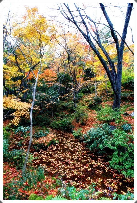 | 常寂光寺的後面有個日式庭園,有小溪、銀杏跟紅葉,