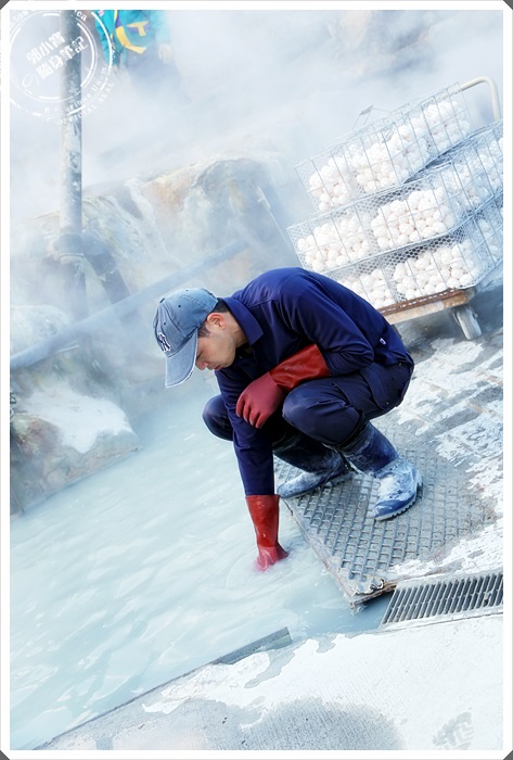 看到工作人員忙錄的將雞蛋放在高溫的溫泉池中,過一下子拿出來就黑了,
