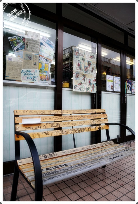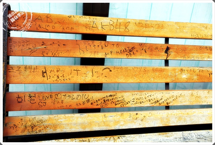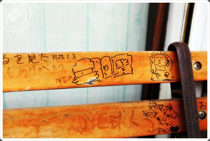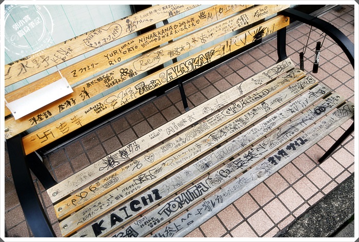| 店門口有兩個長條椅,被簽滿了名,椅子旁有掛著簽字筆,如果你想要到此一遊的話,