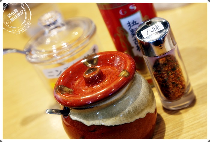 | 桌上的調味料也頗多的,默默的發現拉麵胡椒還滿好用的,後來再超商跟大賣場都找不到這個牌子的拉麵胡椒粉,本來想帶回台灣的。 |