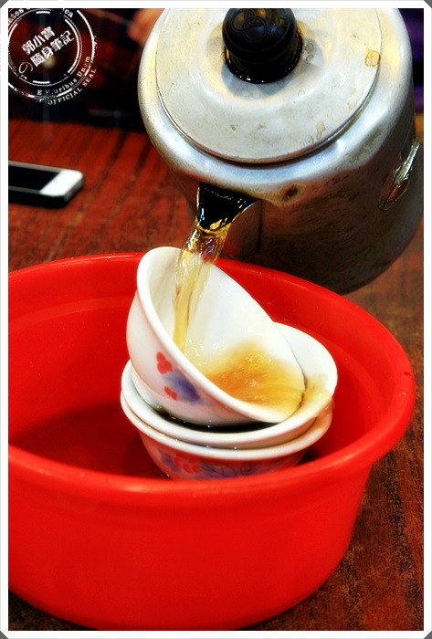 一上桌店家就會上一壺熱茶,桌子上會有一個塑膠盆子,這是要讓你來洗茶杯的,