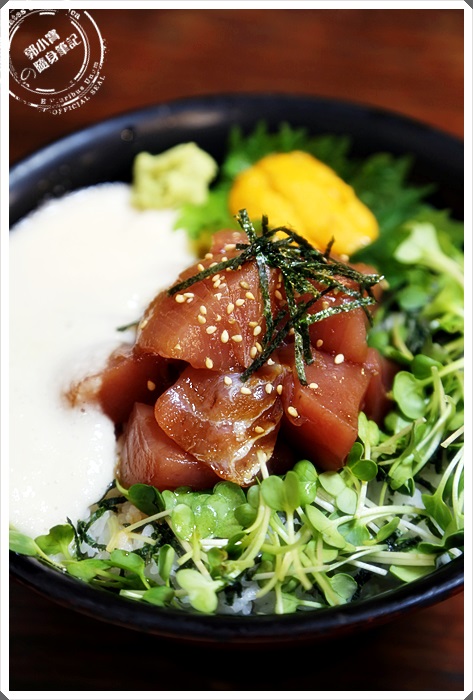 這一碗就是店內比較有人氣的海鮮丼,上面有兩片馬糞海點跟生魚片切丁,白色的好像是沙拉醬汁,一旁舖上了野菜,整晚看起來也非常的超值,但是這一碗不是我點的,所以我也不知道到底滋味如何,但是看到同行的朋友吃的津津有味,我想應該是還不錯的。 |