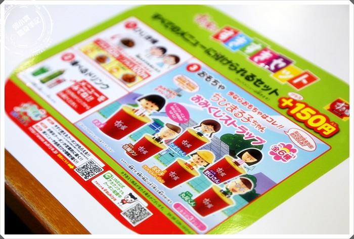 | すき家最讓家庭客喜愛的就是它有兒童餐,而且還常常會換主題,上次我記得看到的是麵包超人,這次又換成櫻桃小丸子了,不只是小孩子喜歡,連年輕女生都很喜歡。 |