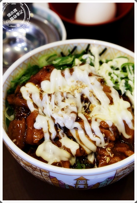 | 剛送上來的時候會是這樣一碗,因為在菜單上面看到的是還有一顆蛋黃,所以會一起送一顆生雞蛋過來,蛋要自己打的,旁邊有打蛋器所以還滿方便簡單的, |