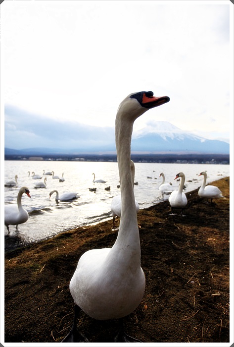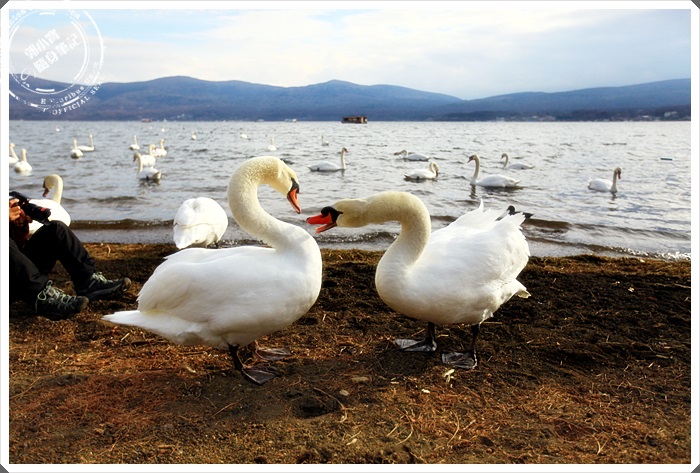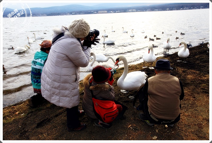 | 途中看到一群老人家的攝影隊在拍天鵝,這邊的天鵝一點都不怕生,可能跟日本也不吃鵝肉有關係吧,山中湖的天鵝每一隻都潔白的要命,跟台灣髒髒的天鵝完全不一樣。 |