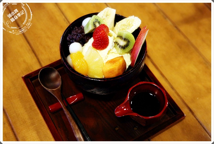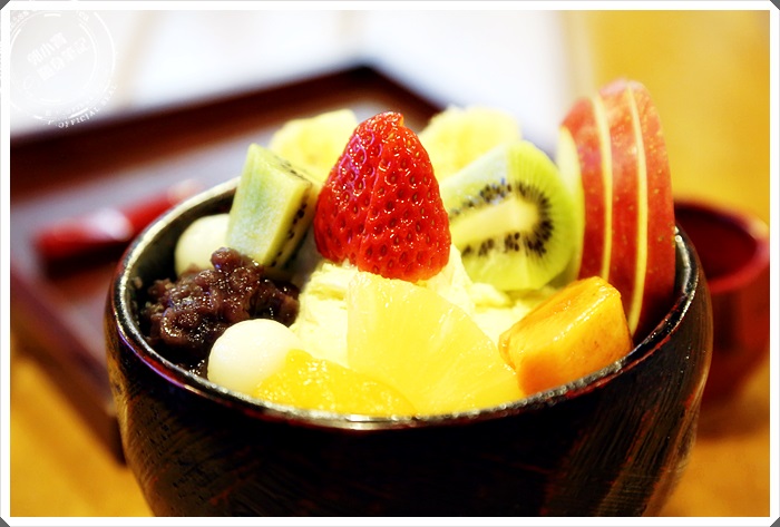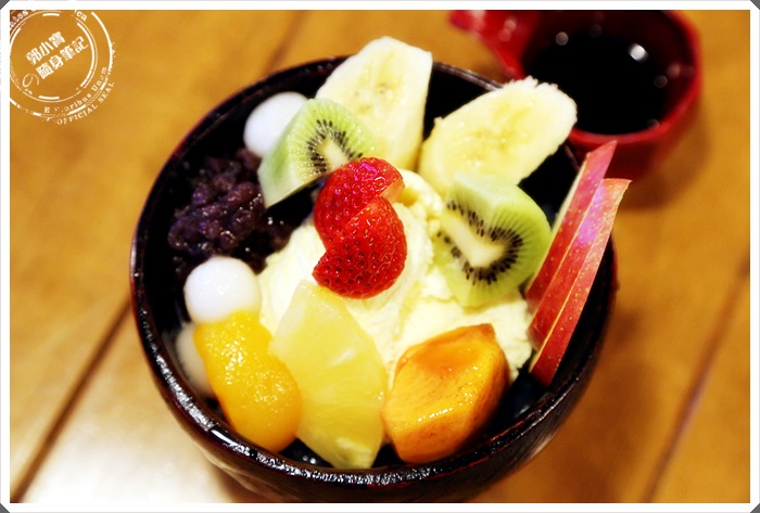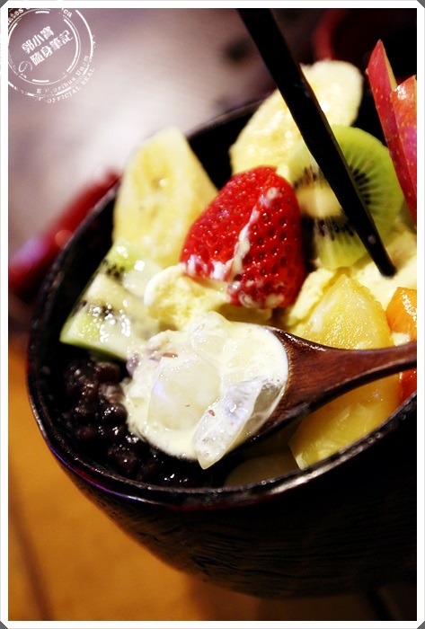 | 下大雪還是要吃冰,看我們多愛吃冰就好了,不過這碗冰品真的是好漂亮又精製,上面放滿了水果以外,還有幾個圓潤的白玉湯圓跟蜜紅豆,色彩相當的豐富又鮮豔。 |