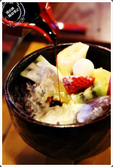 | 會附上一小壺的黑糖膏,應該是黑糖膏沒錯,吃起來甜滋滋卻不讓人討厭,其實這比較接近一碗水果盛合,裡面只有一球冰而已。 |