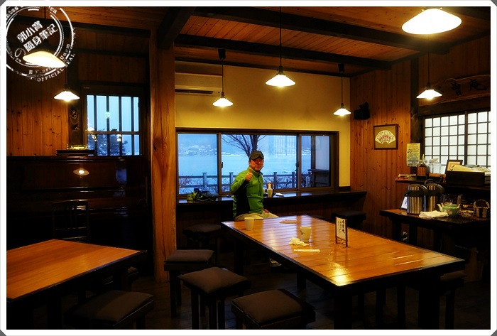 | 店內其實沒有多少位子,一排靠窗可以看到河口湖風景的位子大概可以做3。4個人,中間一個大桌子應該是來學茶道的人使用,一旁還有有一個和式的小包廂。 |
