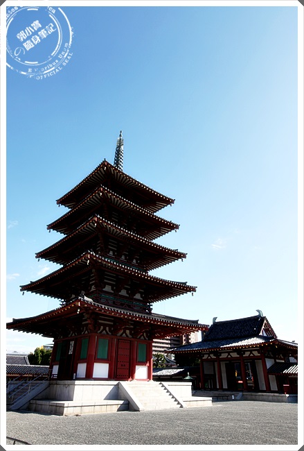 | 四天王寺的五重塔,進去這邊要另外付費,似乎是500日幣的樣子,因為我們去過太多日本的寺廟了,所以說真的提不起勁在衝內寺廟,所以就遙看五重塔了。 |