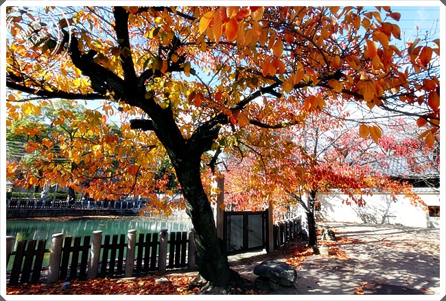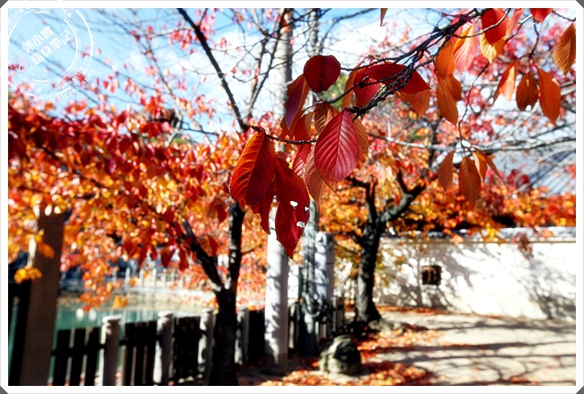 | 一旁的小池塘旁三三兩兩的紅葉,搭配著藍天白雲的天空,心情好得像是一幅畫。 |