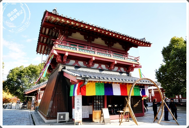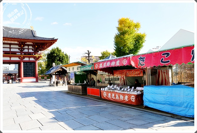 | 穿過朱紅色的門堂後看到許多攤販,此時在有濃濃秋意的日本,有太陽公公的熱情真的非常的舒服,讓陽光灑落在臉上的感覺真棒。 |