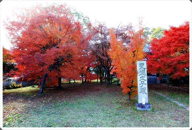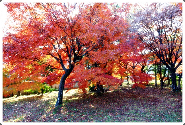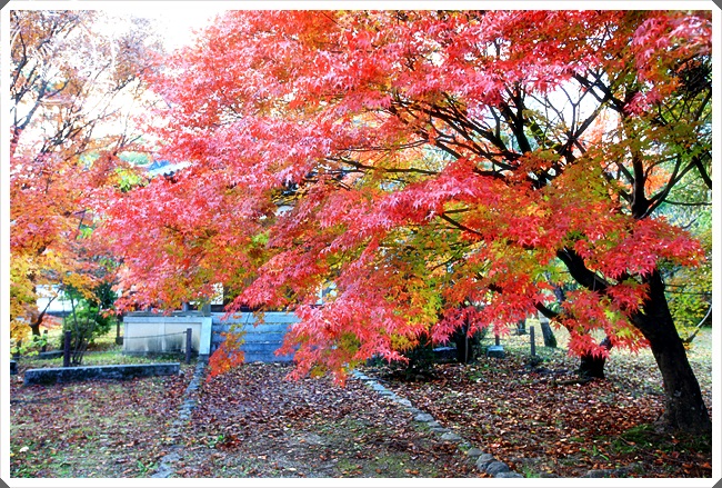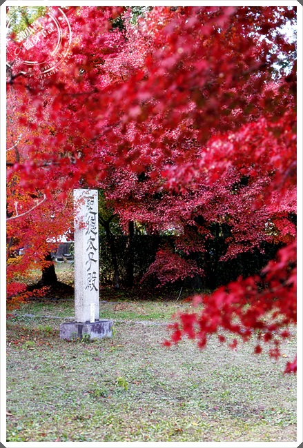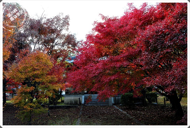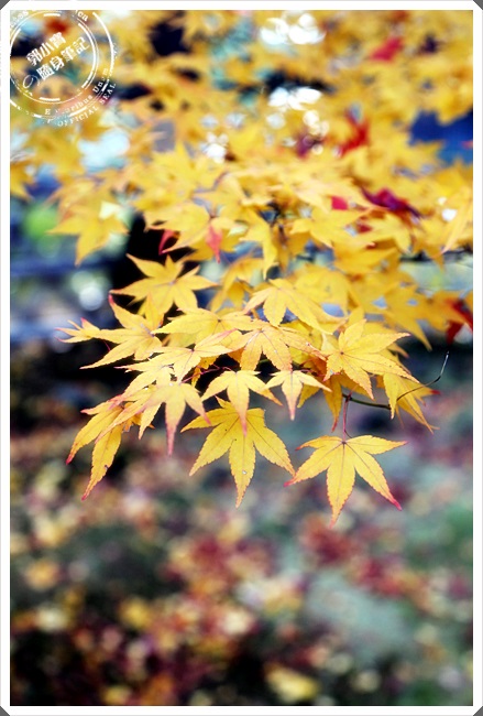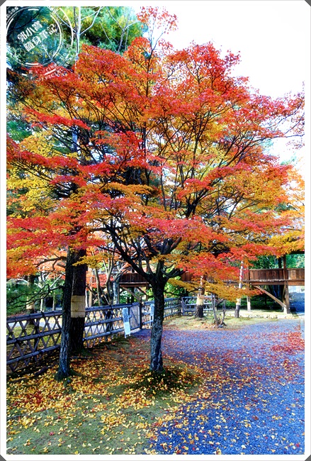 | 進入城門的左手邊就有一大片紅葉林,紅葉正盛開的相當美麗,紅的徹底,但可惜底下的落葉都已經枯黃了,最美的紅葉就是要帶幾顆銀杏才美啊!!! |