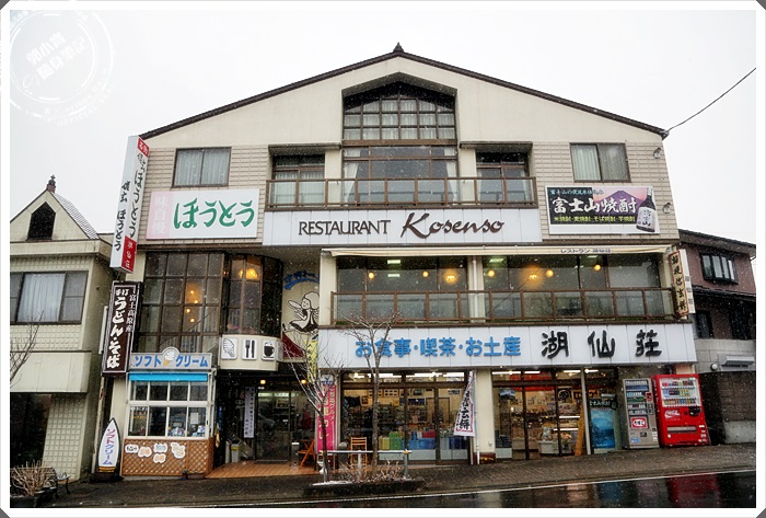 到達本栖湖的時候因為大雪紛飛,所以本栖湖基本上不管是遊覽船還是觀光活動幾乎都沒有開放,整個湖邊幾乎都是沒有人,簡單的拍了一些照片後我們就回到了大馬路上,整條大馬路上也沒有商家開門,孤伶伶的就只有這一家湖仙莊有營業,看起來是一家販售拌手禮的店面,但是因為到達本栖湖的時候已經是中午時分了,我們兩個在飢寒交迫的情況下,還是硬著頭皮進去看看。