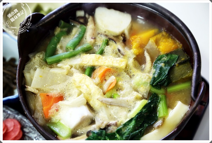 | 麵實的內容物似乎相當的豐富,也有一點像野菜鍋的樣子,看起來熱呼呼的相當的美味,喝了一口湯後整個身子都暖和了起來,湯頭還滿甜的,是那種充滿了蔬菜鮮甜的甘甜滋味。 |