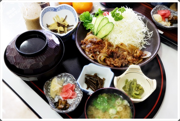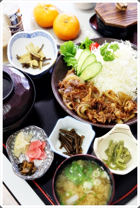 | MO貴人點的燒肉定食感覺起來就可口許多,但是燒肉的量不是很多,一樣有很多醃漬物搭配,一大碗白飯跟味噌湯。 |