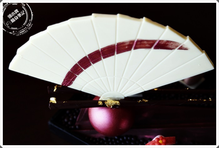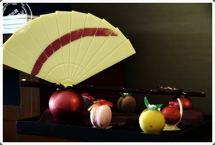 一整麵文華東方的扇子LOGO都是用白巧克力製作而成,幾乎你可以看到的部分都是巧克力。