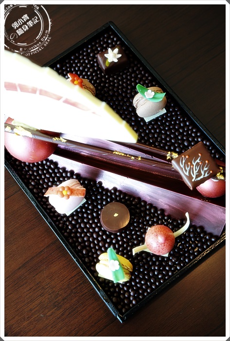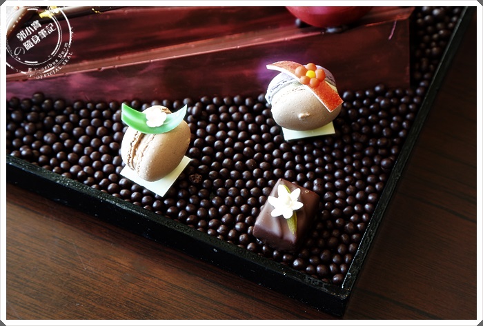 搭配著底座的巧克力小球,上面放著馬卡龍及巧克力磚,簡直是巧奪天功的技術,