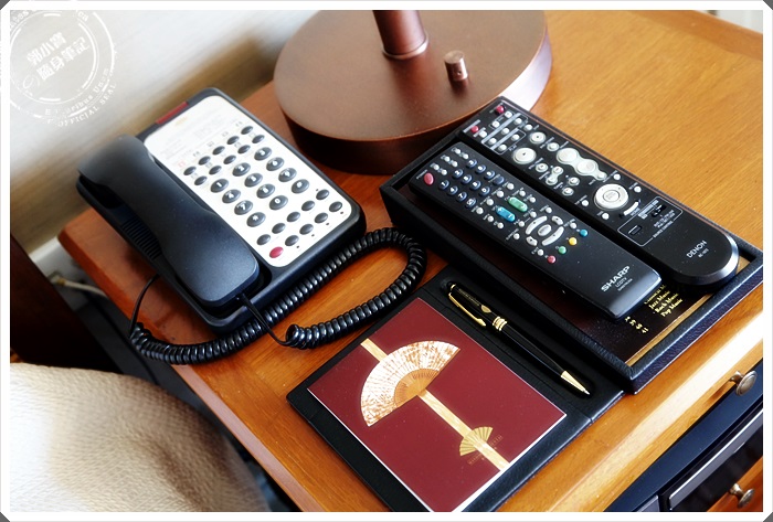 | 床鋪旁邊的小桌几上放著電視與音響的搖控器,書桌跟桌几上都有電話。 |