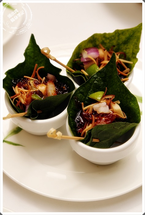 | 泰式三層點心櫃比較特別的就在第二層,一看就一整個泰式風格點心,每一個小點心都用葉子包起來非常的精緻。 |