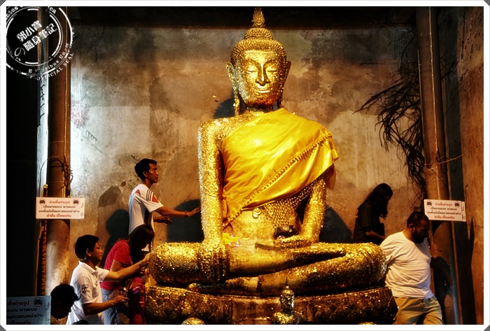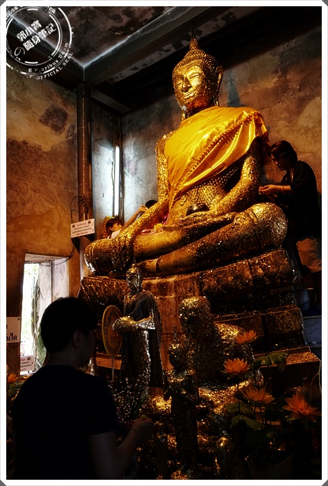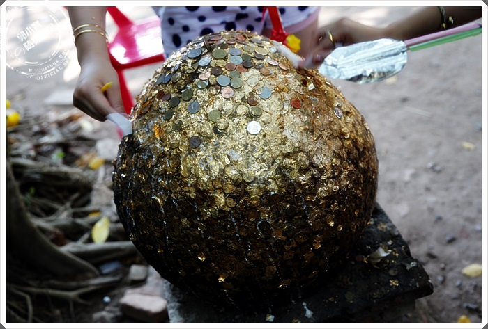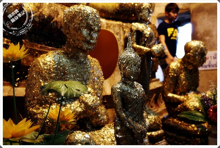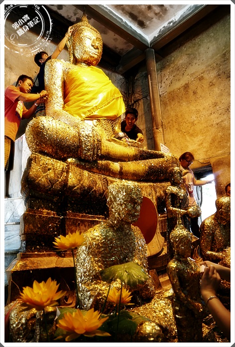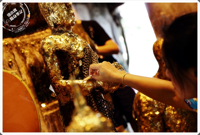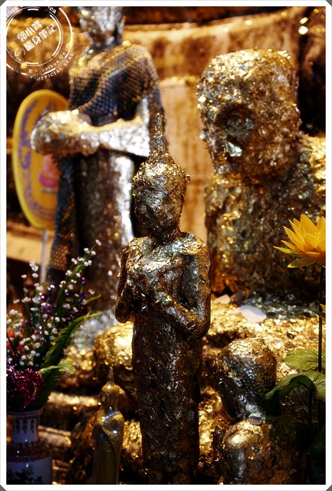 | 整座廟的大大小小的佛像,幾乎都是金光閃閃的,其實一開始並不是這樣金光閃閃的,都是靠信徒們一人一張金箔貼上去的,貼到這樣整間廟都是金色的真的很壯觀,而且每天都還在增加中,就連剛剛門口照片那張照片裡面的金球,也是原本事一顆石頭,被信徒貼到整個球都變金色了。 |