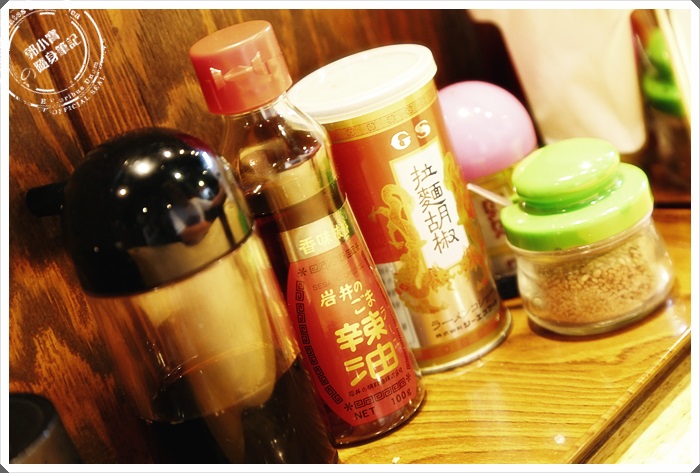把我買的食眷拿給工作人員後,我們選擇了板前坐了下來等待我們的拉麵到來,四天王桌上的調味料還挺多的。