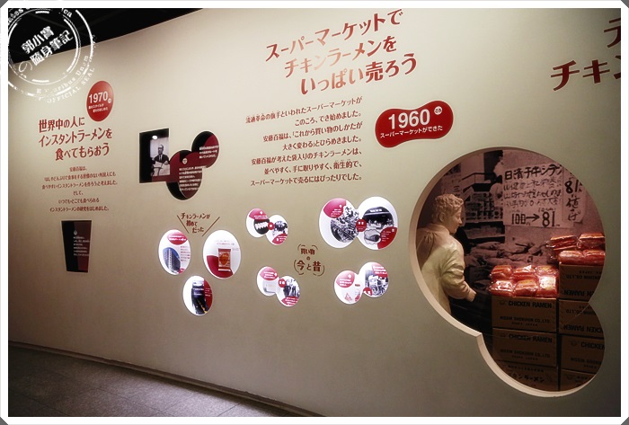 | 沿著通道走就可以看到牆壁很多布置物,訴說著日清泡麵這些年的研發苦心,老實說人家日本人的觀光工廠真的超用心,做的東西也很精製,重點還不用收錢咧,台灣的觀光工廠真的要加油了。 |