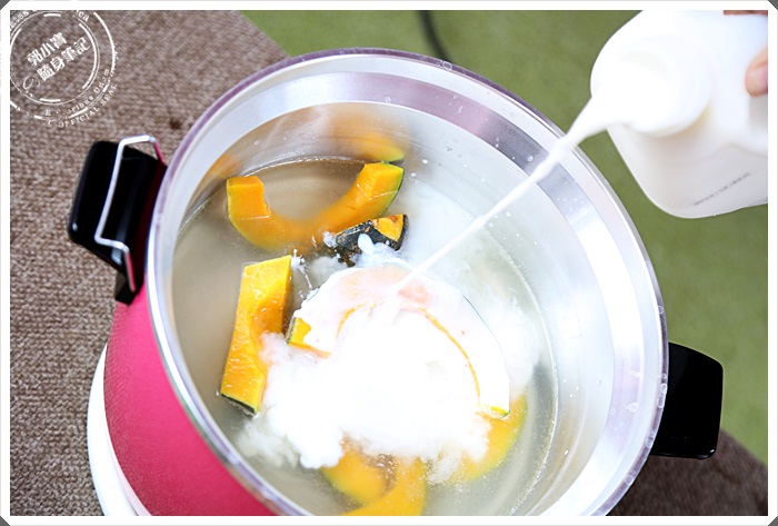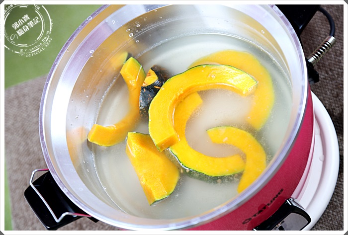 | 等到雞湯塊融化的時候,接著就把南瓜切塊通通丟下去熬煮,其實南瓜還滿好煮的,等到這些步驟都完成的時候,南瓜大概也熟爛了,等到水開始翻動沸騰的時候就差不多了。 |