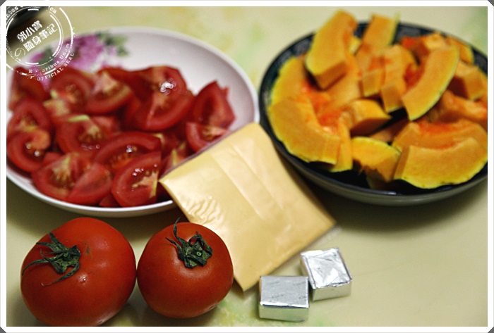 步驟三 將洗好並切塊的牛番茄、南瓜放入牛奶鍋中