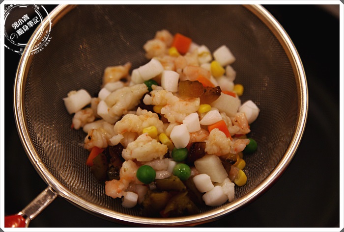 | 加上剛剛稍微川燙過的海鮮,一且倒入平底鍋內,起鍋前在淋上鮮乳,可以增加白色的鮮明感跟滑口感。 |