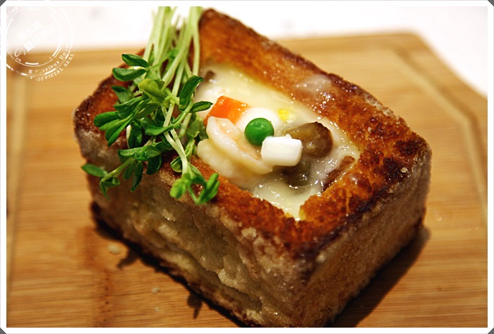 將煮好的海鮮白醬倒入蜜糖吐司磚塊中,在加上裝飾一整個就超下午茶的啊!!!