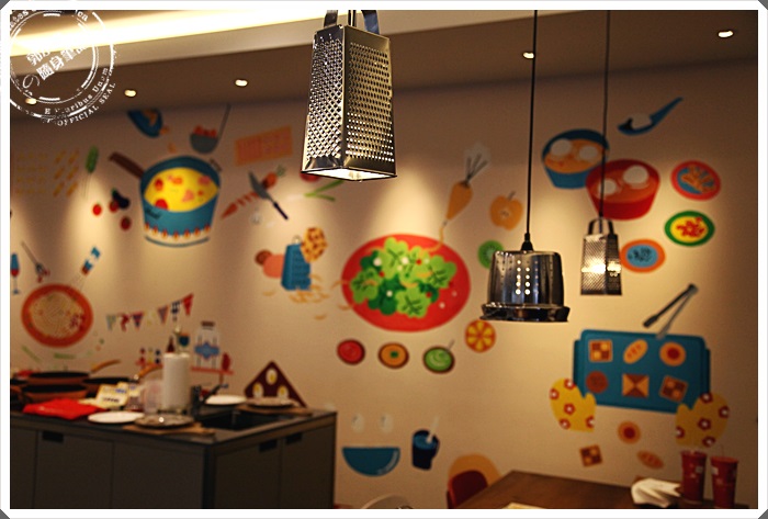 | 這次的場地我個人覺得還滿好的,整體的空間還滿溫馨柔和,加上牆上的童趣壁畫跟寬敞的廚藝教室,還滿受歡迎的一個料理教室,重點它就在台電大樓捷運站五號出口一出來就是了@@ |