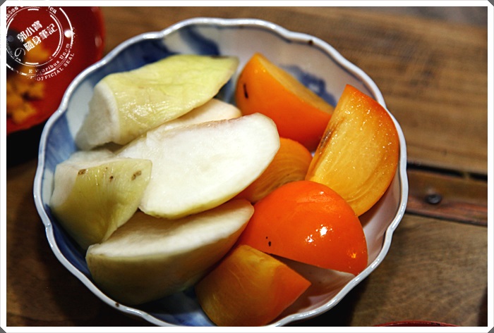 | 店家招待的醃蘿蔔跟醃柿子,蘿蔔水份依然相當的多,柿子很甜水分又多,一下子就被我們吃光了。 |
